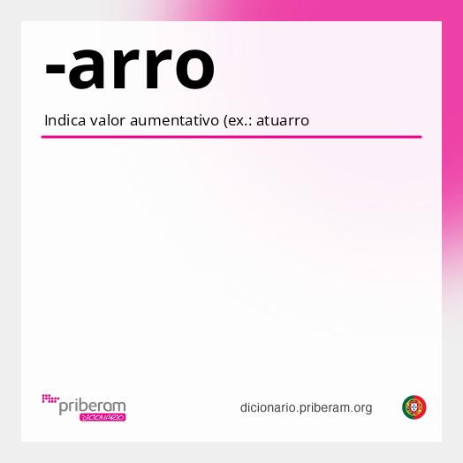 -arro Sabia que? Pode consultar o significado de qualquer palavra abaixo com um clique. Experimente! -arro-arro sufixo Indica valor aumentativo (ex.: atuarro; chibarro). Origem:etimologia obscura. Secção de palavras relacionadas