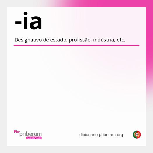 -ia A forma -iapode ser[sigla] ou [sufixo]. Sabia que? Pode consultar o significado de qualquer palavra abaixo com um clique. Experimente! -ia-ia sufixo Designativo de estado, profissão, indústria, etc. Secção de palavras relacionadas I.A.I.A.I.A. |ì-á| |ì-á| sigla Sigla de inteligência artificial. Secção de palavras relacionadas