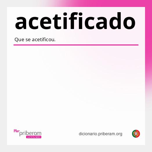 acetificado A forma acetificadopode ser [masculino singular particípio passado de acetificaracetificar] ou [adjectivoadjetivo]. Sabia que? Pode consultar o significado de qualquer palavra abaixo com um clique. Experimente! acetificadoacetificado ( a·ce·ti·fi·ca·do a·ce·ti·fi·ca·do ) adjectivoadjetivo Que se acetificou. Origem:particípio de acetificar. Secção de palavras relacionadas acetificaracetificar ( a·ce·ti·fi·car a·ce·ti·fi·car ) ConjugarConjugar Conjugação:regular. Particípio:regular. verbo transitivo e pronominal 1. Tornar ou ficar ácido. = AZEDAR 2. Converter ou converter-se em ácido acético. = SinónimoSinônimo geral: ACETAR Origem:latim acetum, -i, vinagre + -ficar. Secção de palavras relacionadas