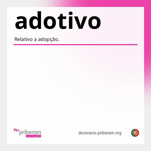 adoptivo Sabia que? Pode consultar o significado de qualquer palavra abaixo com um clique. Experimente! adoptivoadotivoadotivo |òt| |òt| |òt| ( a·dop·ti·vo a·do·ti·vo a·do·ti·vo ) adjectivoadjetivo 1. Relativo a adopção. 2. Que foi adoptada. 3. Que adopta. 4. Enxertado. Secção de palavras relacionadas Grafia alterada pelo Acordo Ortográfico de 1990: adotivo. Grafia anterior ao Acordo Ortográfico de 1990: adoptivo. Grafia no Brasil:adotivo. Grafia em Portugal:adoptivo.