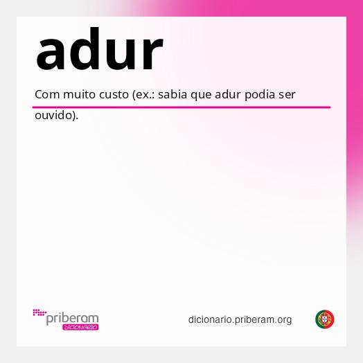 adur Sabia que? Pode consultar o significado de qualquer palavra abaixo com um clique. Experimente! aduradur ( a·dur a·dur ) advérbio [Antigo] [Antigo] Com muito custo (ex.: sabia que adur podia ser ouvido). = DIFICILMENTE Origem:latim ad, a, para, até + latim durum, asperamente. Secção de palavras relacionadas