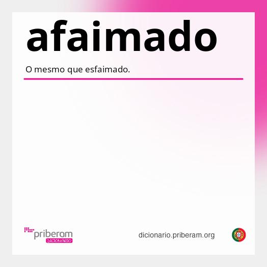 afaimado A forma afaimadopode ser [masculino singular particípio passado de afaimarafaimar] ou [adjectivoadjetivo]. Sabia que? Pode consultar o significado de qualquer palavra abaixo com um clique. Experimente! afaimadoafaimado ( a·fai·ma·do a·fai·ma·do ) adjectivoadjetivo O mesmo que esfaimado. Origem:particípio de afaimar. Secção de palavras relacionadas afaimarafaimar ( a·fai·mar a·fai·mar ) ConjugarConjugar Conjugação:regular. Particípio:regular. verbo transitivo O mesmo que esfaimar. Origem:a- + latim fames, -is, fome + -ar. Secção de palavras relacionadas