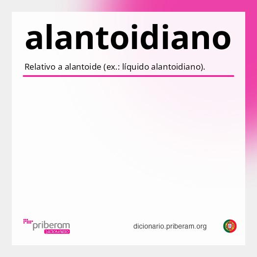 alantoidiano Sabia que? Pode consultar o significado de qualquer palavra abaixo com um clique. Experimente! alantoidianoalantoidiano ( a·lan·toi·di·a·no a·lan·toi·di·a·no ) adjectivoadjetivo [Zoologia] [Zoologia] Relativo a alantóide (ex.: líquido alantoidiano). = ALANTÓICO Origem:alantóide + -iano. Secção de palavras relacionadas