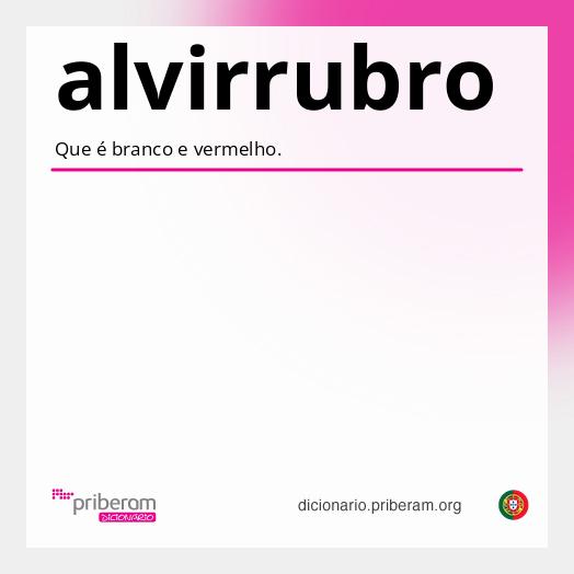 alvirrubro Sabia que? Pode consultar o significado de qualquer palavra abaixo com um clique. Experimente! alvirrubroalvirrubro ( al·vir·ru·bro al·vir·ru·bro ) adjectivoadjetivo 1. Que é branco e vermelho. adjectivo e nome masculinoadjetivo e nome masculino 2. [Desporto] [Esporte] Que ou quem pertence a uma equipa ou a um clube cujas cores habituais são o branco e o vermelho. Origem:alvi- + rubro. Secção de palavras relacionadas