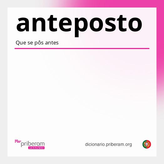 anteposta A forma antepostapode ser [feminino singular de antepostoanteposto] ou [feminino singular particípio passado de anteporantepor]. Sabia que? Pode consultar o significado de qualquer palavra abaixo com um clique. Experimente! anteporantepor |ô| |ô| ( an·te·por an·te·por ) ConjugarConjugar Conjugação:irregular. Particípio:irregular. verbo transitivo 1. Pôr antes. 2. Escolher ou gostar mais de um entre vários. = MAIS-QUERER, PREFERIR Origem:latim antepono, -ere. Secção de palavras relacionadas antepostoanteposto |pô| |pô| ( an·te·pos·to an·te·pos·to ) adjectivoadjetivo Que se pôs antes; que se antepôs. Origem:latim antepositus, -a, -um, particípio passado de antepono, -ere, antepor. Secção de palavras relacionadas