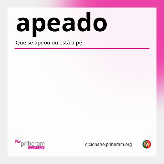 apeados A forma apeadospode ser [masculino plural de apeadoapeado] ou [masculino plural particípio passado de apearapear]. Sabia que? Pode consultar o significado de qualquer palavra abaixo com um clique. Experimente! apearapear ( a·pe·ar a·pe·ar ) ConjugarConjugar Conjugação:regular. Particípio:regular. verbo transitivo, intransitivo e pronominal 1. Pôr a pé; desmontar. 2. Deitar abaixo. 3. Privar. 4. Demitir, suprimir. Origem:a- + pé + -ar. Secção de palavras relacionadas apeadoapeado ( a·pe·a·do a·pe·a·do ) adjectivoadjetivo 1. Que se apeou ou está a pé. 2. Que desceu de uma montaria ou de um veículo. 3. Que é feito a pé (ex.: pesca apeada). 4. [Figurado] [Figurado] Que foi privado ou destituído de algo importante. Origem:particípio de apear. Secção de palavras relacionadas