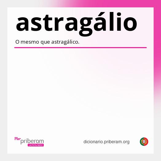 astragálio Sabia que? Pode consultar o significado de qualquer palavra abaixo com um clique. Experimente! astragálioastragálio ( as·tra·gá·li·o as·tra·gá·li·o ) adjectivoadjetivo O mesmo que astragálico. Origem:astrágalo + -io. Secção de palavras relacionadas