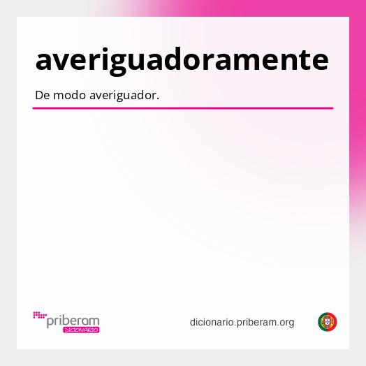 averiguadoramente A forma averiguadoramentepode ser [derivação de averiguadoraveriguador] ou [advérbio]. Sabia que? Pode consultar o significado de qualquer palavra abaixo com um clique. Experimente! averiguadoramenteaveriguadoramente ( a·ve·ri·gua·do·ra·men·te a·ve·ri·gua·do·ra·men·te ) advérbio De modo averiguador. Origem:averiguador + -mente. Secção de palavras relacionadas averiguadoraveriguador |ô| |ô| ( a·ve·ri·gua·dor a·ve·ri·gua·dor ) adjectivo e nome masculinoadjetivo e nome masculino Que ou o que averigua. Secção de palavras relacionadas
