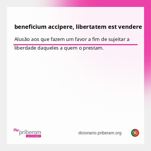 beneficium accipere, libertatem est vendere Sabia que? Pode consultar o significado de qualquer palavra abaixo com um clique. Experimente! beneficium accipere, libertatem est venderebeneficium accipere, libertatem est vendere locução Alusão aos que fazem um favor a fim de sujeitar a liberdade daqueles a quem o prestam. Origem:locução latina que significa "aceitar um benefício é vender a liberdade". Secção de palavras relacionadas Fonte: Publílio Siro, 61.