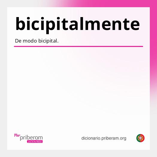 bicipitalmente Sabia que? Pode consultar o significado de qualquer palavra abaixo com um clique. Experimente! bicipitalmentebicipitalmente ( bi·ci·pi·tal·men·te bi·ci·pi·tal·men·te ) advérbio De modo bicipital. Origem:bicipital + -mente. Secção de palavras relacionadas