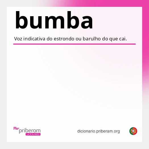 bumba Sabia que? Pode consultar o significado de qualquer palavra abaixo com um clique. Experimente! bumbabumba ( bum·ba bum·ba ) interjeição 1. Voz indicativa do estrondo ou barulho do que cai. nome masculino 2. [Brasil: Ceará] [Brasil: Ceará] [Música] [Música] Tambor grande, de som grave. = BOMBO, ZABUMBA 3. [Brasil: Pernambuco] [Brasil: Pernambuco] [Etnografia] [Etnografia] O mesmo que bumba-meu-boi. Origem:etimologia onomatopaica. Secção de palavras relacionadas Confrontar: bomba.