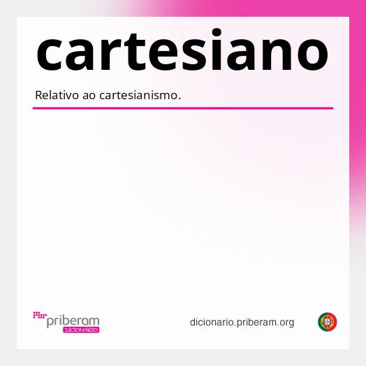 cartesiana A forma cartesianaé [feminino singular de cartesianocartesiano]. Sabia que? Pode consultar o significado de qualquer palavra abaixo com um clique. Experimente! cartesianocartesiano ( car·te·si·a·no car·te·si·a·no ) adjectivoadjetivo 1. Relativo ao cartesianismo. nome masculino 2. Partidário do cartesianismo. Secção de palavras relacionadas Confrontar: cartusiano.