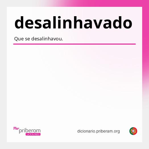 desalinhavado A forma desalinhavadopode ser [masculino singular particípio passado de desalinhavardesalinhavar] ou [adjectivoadjetivo]. Sabia que? Pode consultar o significado de qualquer palavra abaixo com um clique. Experimente! desalinhavadodesalinhavado ( de·sa·li·nha·va·do de·sa·li·nha·va·do ) adjectivoadjetivo Que se desalinhavou. Origem:particípio de desalinhavar. Secção de palavras relacionadas desalinhavardesalinhavar ( de·sa·li·nha·var de·sa·li·nha·var ) ConjugarConjugar Conjugação:regular. Particípio:regular. verbo transitivo Tirar os alinhavos a. Origem:des- + alinhavar. Secção de palavras relacionadas