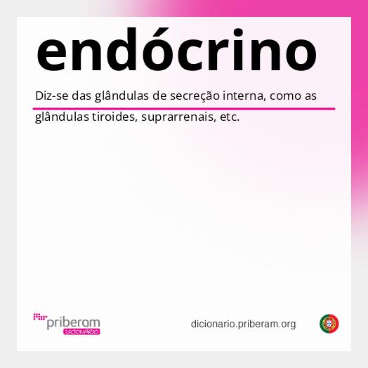 endócrino Sabia que? Pode consultar o significado de qualquer palavra abaixo com um clique. Experimente! endócrinoendócrino ( en·dó·cri·no en·dó·cri·no ) adjectivoadjetivo [Medicina] [Medicina] Diz-se das glândulas de secreção interna, como as glândulas tiróides, supra-renais, etc. Origem:endo- + grego krínô, separar, distinguir, segregar. Secção de palavras relacionadas