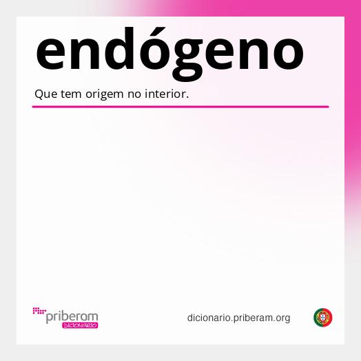 endogenamente A forma endogenamentepode ser [derivação de endógenoendógeno] ou [advérbio]. Sabia que? Pode consultar o significado de qualquer palavra abaixo com um clique. Experimente! endogenamenteendogenamente ( en·do·ge·na·men·te en·do·ge·na·men·te ) advérbio De modo endógeno. Origem:endógeno + -mente. Secção de palavras relacionadas endógenoendógeno ( en·dó·ge·no en·dó·ge·no ) adjectivoadjetivo 1. Que tem origem no interior. 2. [Botânica] [Botânica] Que cresce para dentro. = SinónimoSinônimo geral: ENDOGÉNICO Origem:endo- + -geno. Secção de palavras relacionadas
