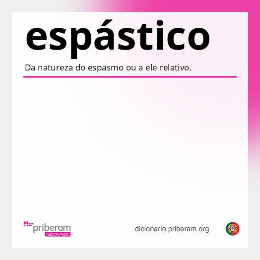 espástico Sabia que? Pode consultar o significado de qualquer palavra abaixo com um clique. Experimente! espásticoespástico ( es·pás·ti·co es·pás·ti·co ) adjectivoadjetivo Relativo a espasmo ou em que há espasmos (ex.: colite espástica; dores espásticas; movimentos espásticos; paralisia espástica). = ESPASMÓDICO Origem:latim spasticus, -a, -um. Secção de palavras relacionadas