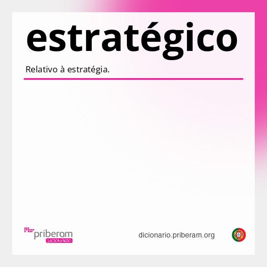 estratégico Sabia que? Pode consultar o significado de qualquer palavra abaixo com um clique. Experimente! estratégicoestratégico ( es·tra·té·gi·co es·tra·té·gi·co ) adjectivoadjetivo 1. Relativo à estratégia. 2. Ardiloso, hábil. Secção de palavras relacionadas