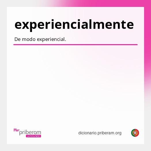experiencialmente A forma experiencialmentepode ser [derivação de experiencialexperiencial] ou [advérbio]. Sabia que? Pode consultar o significado de qualquer palavra abaixo com um clique. Experimente! experiencialmenteexperiencialmente ( ex·pe·ri·en·ci·al·men·te ex·pe·ri·en·ci·al·men·te ) advérbio De modo experiencial. Origem:experiencial + -mente. Secção de palavras relacionadas experiencialexperiencial ( ex·pe·ri·en·ci·al ex·pe·ri·en·ci·al ) adjectivo de dois génerosadjetivo de dois géneros 1. Relativo à experiência. 2. Que resulta da experiência. Origem:experiência + -al. Plural: experienciais. Plural: experienciais. Secção de palavras relacionadas