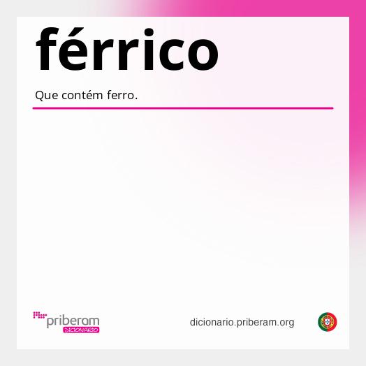 férrico Sabia que? Pode consultar o significado de qualquer palavra abaixo com um clique. Experimente! férricoférrico ( fér·ri·co fér·ri·co ) adjectivoadjetivo 1. [Química] [Química] Que contém ferro. 2. [Química] [Química] Relativo ao ferro ou aos seus compostos químicos. Origem:ferro + -ico. Secção de palavras relacionadas