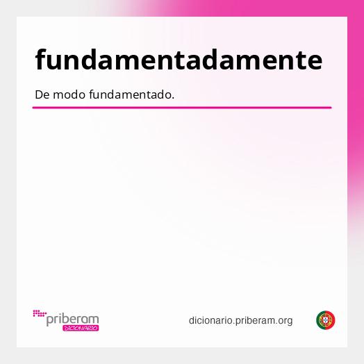 fundamentadamente A forma fundamentadamentepode ser [derivação de fundamentadofundamentado] ou [advérbio]. Sabia que? Pode consultar o significado de qualquer palavra abaixo com um clique. Experimente! fundamentadamentefundamentadamente ( fun·da·men·ta·da·men·te fun·da·men·ta·da·men·te ) advérbio De modo fundamentado. Origem:fundamentado + -mente. Secção de palavras relacionadas fundamentadofundamentado ( fun·da·men·ta·do fun·da·men·ta·do ) adjectivoadjetivo 1. Que se fundamentou. 2. Que tem fundamento, bases ou razões. Origem:particípio de fundamentar. Secção de palavras relacionadas