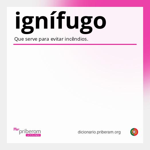 ignífugo Será que queria dizer ignifugo? Sabia que? Pode consultar o significado de qualquer palavra abaixo com um clique. Experimente! ignífugoignífugo ( ig·ní·fu·go ig·ní·fu·go ) adjectivoadjetivo 1. Que serve para evitar incêndios. 2. Que afugenta o fogo. 3. Incombustível. Origem:igni- + -fugo. Secção de palavras relacionadas