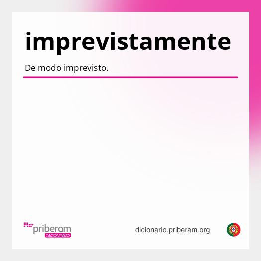 imprevistamente A forma imprevistamentepode ser [derivação de imprevistoimprevisto] ou [advérbio]. Sabia que? Pode consultar o significado de qualquer palavra abaixo com um clique. Experimente! imprevistamenteimprevistamente ( im·pre·vis·ta·men·te im·pre·vis·ta·men·te ) advérbio De modo imprevisto. Origem:imprevisto + -mente. Secção de palavras relacionadas imprevistoimprevisto ( im·pre·vis·to im·pre·vis·to ) adjectivoadjetivo 1. Não previsto; que não se previu. = INESPERADO, INOPINADO ≠ CALCULADO, ESPERADO, PREVISTO 2. Que surpreende ou surge de repente. = REPENTINO, SUBITÂNEO, SÚBITO 3. Que não prevê ou que não toma precauções. = DESACAUTELADO, IMPREVIDENTE ≠ PRECAVIDO, PREVIDENTE nome masculino 4. Facto que não se espera ou que não se pode prever (ex.: é preciso contar com os imprevistos). = IMPONDERÁVEL, IMPREVISÍVEL Origem:im- + previsto. Secção de palavras relacionadas