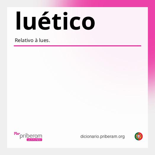 luético Sabia que? Pode consultar o significado de qualquer palavra abaixo com um clique. Experimente! luéticoluético ( lu·é·ti·co lu·é·ti·co ) adjectivoadjetivo 1. [Medicina] [Medicina] Relativo à lues. adjectivo e nome masculinoadjetivo e nome masculino 2. [Medicina] [Medicina] Que ou o que sofre de lues. = SinónimoSinônimo geral: SIFILÍTICO Origem:inglês luetic. Secção de palavras relacionadas