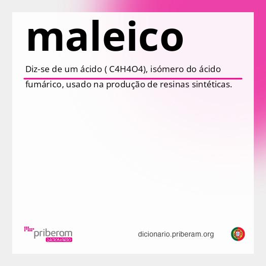 maleico Sabia que? Pode consultar o significado de qualquer palavra abaixo com um clique. Experimente! maleicomaléicomaleico ( ma·lei·co ma·léi·coma·lei·co ) adjectivoadjetivo [Química] [Química] Diz-se de um ácido ( C4H4O4), isómero do ácido fumárico, usado na produção de resinas sintéticas. Origem:francês maléique, de malique, málico, do latim malum, -i, maçã. Secção de palavras relacionadas Grafia no Brasil:maléico. Grafia alterada pelo Acordo Ortográfico de 1990:maleico. Grafia anterior ao Acordo Ortográfico de 1990: maléico. Grafia em Portugal:maleico.