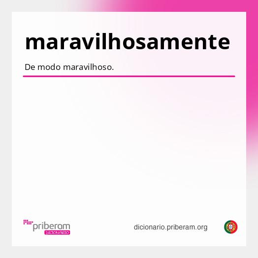 maravilhosamente A forma maravilhosamentepode ser [derivação de maravilhosomaravilhoso] ou [advérbio]. Sabia que? Pode consultar o significado de qualquer palavra abaixo com um clique. Experimente! maravilhosamentemaravilhosamente ( ma·ra·vi·lho·sa·men·te ma·ra·vi·lho·sa·men·te ) advérbio De modo maravilhoso. Origem:maravilhoso + -mente. Secção de palavras relacionadas maravilhosomaravilhoso |lhô| |lhô| ( ma·ra·vi·lho·so ma·ra·vi·lho·so ) adjectivoadjetivo 1. Extraordinário, admirável, sobrenatural. nome masculino 2. O que causa ou encerra maravilha. Origem:maravilha + -oso. Plural: maravilhosos |ó|. Plural: maravilhosos |ó|. Secção de palavras relacionadas