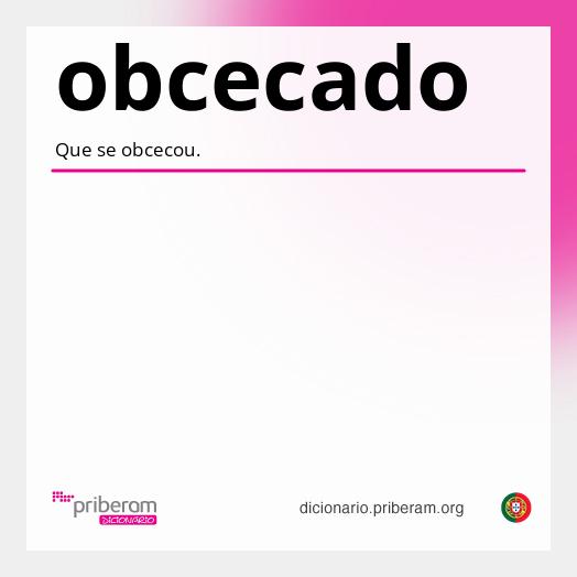 obcecada A forma obcecadapode ser [feminino singular de obcecadoobcecado] ou [feminino singular particípio passado de obcecarobcecar]. Sabia que? Pode consultar o significado de qualquer palavra abaixo com um clique. Experimente! obcecarobcecar ( ob·ce·car ob·ce·car ) ConjugarConjugar Conjugação:regular. Particípio:regular. verbo transitivo e pronominal 1. Cegar, ofuscar. 2. [Figurado] [Figurado] Impor(-se) com insistência no espírito de; causar obsessão. 3. Induzir em erro; desvairar. 4. Deslumbrar. Origem:latim obcaeco, -are, cegar, tornar cego, tornar escuro. Secção de palavras relacionadas obcecadoobcecado ( ob·ce·ca·do ob·ce·ca·do ) adjectivoadjetivo 1. Que se obcecou. 2. [Figurado] [Figurado] Obscurecido, cego de entendimento, ofuscado. 3. Pertinaz no erro. Origem:latim obcaecatus, -a, -um, particípio passado de obcaeco, -are, cegar, tornar cego, tornar escuro. Secção de palavras relacionadas