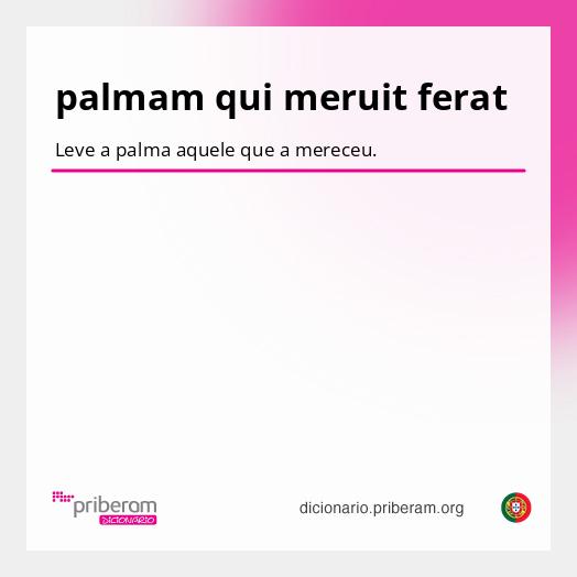 palmam qui meruit ferat Sabia que? Pode consultar o significado de qualquer palavra abaixo com um clique. Experimente! palmam qui meruit feratpalmam qui meruit ferat locução Leve a palma aquele que a mereceu. Origem:locução latina. Secção de palavras relacionadas