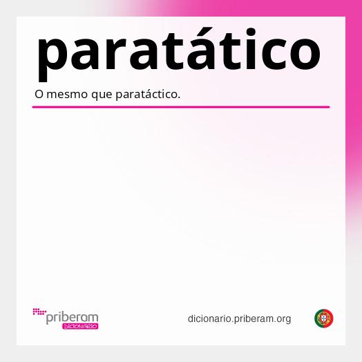 paratático Sabia que? Pode consultar o significado de qualquer palavra abaixo com um clique. Experimente! paratáticoparatático |pà| |pà| ( pa·ra·tá·ti·co pa·ra·tá·ti·co ) adjectivoadjetivo [Brasil] [Brasil] [Gramática] [Gramática] O mesmo que paratáctico. Origem:para- + grego taktikós, -ê, -ón, relativo a arranjo, a ordem. Secção de palavras relacionadas
