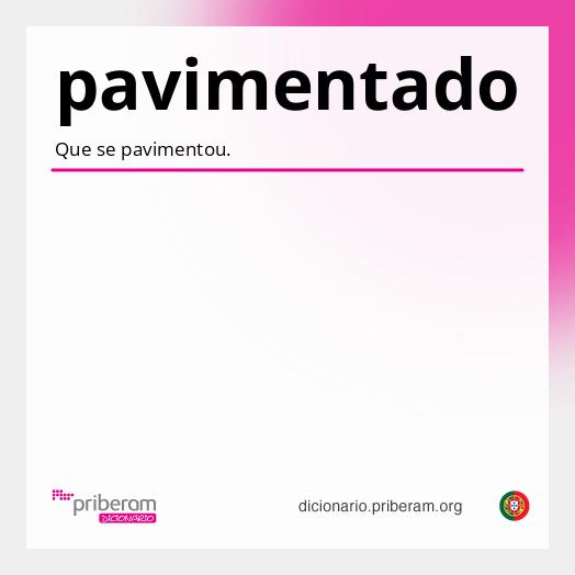 pavimentado A forma pavimentadopode ser [masculino singular particípio passado de pavimentarpavimentar] ou [adjectivoadjetivo]. Sabia que? Pode consultar o significado de qualquer palavra abaixo com um clique. Experimente! pavimentadopavimentado ( pa·vi·men·ta·do pa·vi·men·ta·do ) adjectivoadjetivo Que se pavimentou. Origem:particípio de pavimentar. Secção de palavras relacionadas pavimentarpavimentar ( pa·vi·men·tar pa·vi·men·tar ) ConjugarConjugar Conjugação:regular. Particípio:regular. verbo transitivo Construir pavimento em. Secção de palavras relacionadas