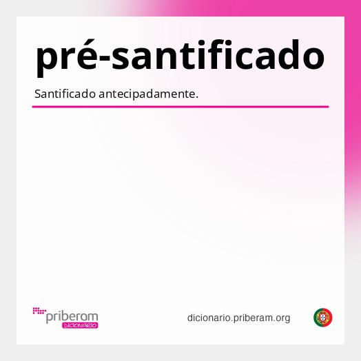 pré-santificado Sabia que? Pode consultar o significado de qualquer palavra abaixo com um clique. Experimente! pré-santificadopré-santificado ( pré·-san·ti·fi·ca·do pré·-san·ti·fi·ca·do ) adjectivoadjetivo Santificado antecipadamente. Origem:pré- + santificado. Plural: pré-santificados. Plural: pré-santificados. Secção de palavras relacionadas
