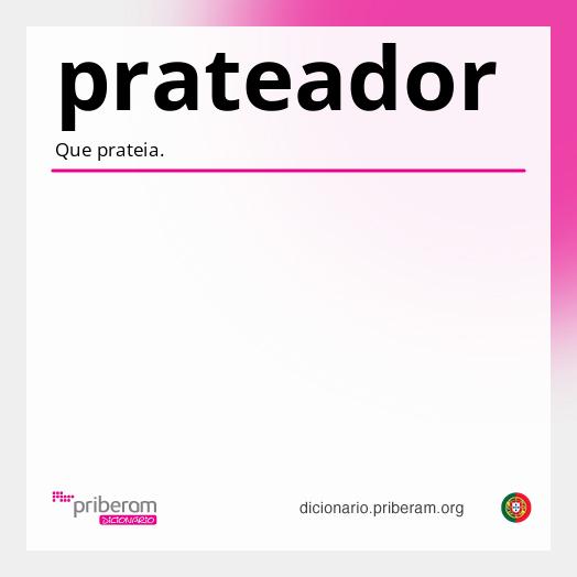 prateadores A forma prateadoresé [masculino plural de prateadorprateador]. Sabia que? Pode consultar o significado de qualquer palavra abaixo com um clique. Experimente! prateadorprateador |ô| |ô| ( pra·te·a·dor pra·te·a·dor ) adjectivoadjetivo 1. Que prateia. nome masculino 2. Homem cujo ofício é pratear objectos. Secção de palavras relacionadas