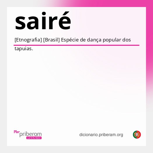 Significado de sairé Sabia que? Pode consultar o significado de qualquer palavra abaixo com um clique. Experimente! sairésairé ( sa·i·ré sa·i·ré ) 1. [Brasil] [Brasil] [Etnografia] [Etnografia] Aparelho de cipó, feito em semicírculo e levado por mulheres índias, ao som da música, em certas festas religiosas. nome masculino 1. [Brasil] [Brasil] [Etnografia] [Etnografia] Espécie de dança popular dos tapuias. Origem:do tupi. Secção de palavras relacionadas
