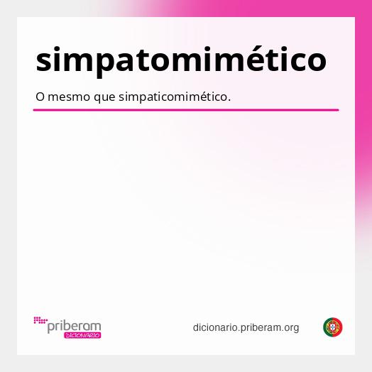 simpatomimético Sabia que? Pode consultar o significado de qualquer palavra abaixo com um clique. Experimente! simpatomiméticosimpatomimético ( sim·pa·to·mi·mé·ti·co sim·pa·to·mi·mé·ti·co ) adjectivoadjetivo [Medicina] [Medicina] O mesmo que simpaticomimético. Origem:simpát[ico] + -o- + mimético. Secção de palavras relacionadas