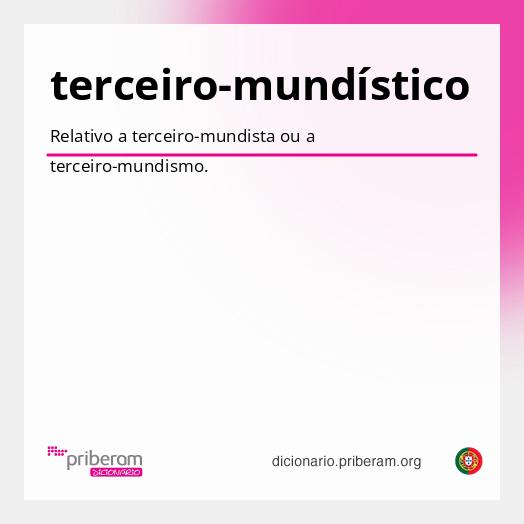 terceiro-mundístico Sabia que? Pode consultar o significado de qualquer palavra abaixo com um clique. Experimente! terceiro-mundísticoterceiro-mundístico ( ter·cei·ro·-mun·dís·ti·co ter·cei·ro·-mun·dís·ti·co ) adjectivoadjetivo Relativo a terceiro-mundista ou a terceiro-mundismo. Origem:terceiro-mundista + -ico. Plural: terceiro-mundísticos. Plural: terceiro-mundísticos. Secção de palavras relacionadas