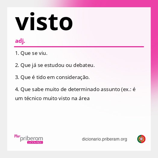 .&definitions[]=%7CF%C3%B3rmula%20ou%20assinatura%20que%20d%C3%A1%20validade%20a%20um%20documento.&definitions[]=%7CAutoriza%C3%A7%C3%A3o%20de%20entrada%20num%20pa%C3%ADs%20estrangeiro%20(ex.%3A%20foi%20%C3%A0%20embaixada%20pedir%20o%20visto).&definitions[]=%7CSinal%20gr%C3%A1fico,%20geralmente%20semelhante%20%C3%A0%20letra%20V,%20que%20indica%20que%20algo%20foi%20feito%20ou%20verificado.&definitions[]=%7CIndica%20causa%20(ex.%3A%20visto%20haver%20muitas%20d%C3%BAvidas,%20%C3%A9%20necess%C3%A1rio%20um%20esclarecimento).&definitions[]=%7C%C3%89%20claro%20que,%20%C3%A9%20%C3%B3bvio%20que.&definitions[]=%7CA%20julgar%20pelo%20que%20se%20v%C3%AA%3B%20ao%20que%20tudo%20indica%3B%20na%20apar%C3%AAncia%20(ex.%3A%20pelos%20vistos,%20mudaram%20de%20planos).&definitions[]=%7CO%20mesmo%20que%20pelos%20vistos.&definitions[]=%7CExpress%C3%A3o%20que%20indica%20causa%20e%20introduz%20uma%20frase%20subordinada%20(ex.%3A%20visto%20que%20estamos%20atrasados,%20n%C3%A3o%20vamos%20fazer%20uma%20pausa).)